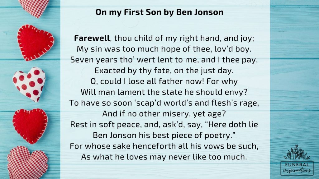 It was written by the English poet Ben Jonson after the death of his 7-year-old son, which was read at his childs funeral, and, like the best poetry, is a beautiful exploration of the poet’s feelings as he deals with this terrible loss. The full text of the poem is below: