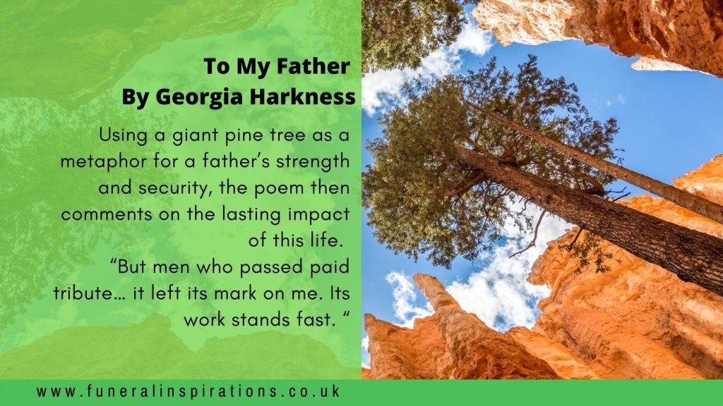 Using a giant pine tree as a metaphor for a father’s strength and security, the poem then comments on the lasting impact of this life.