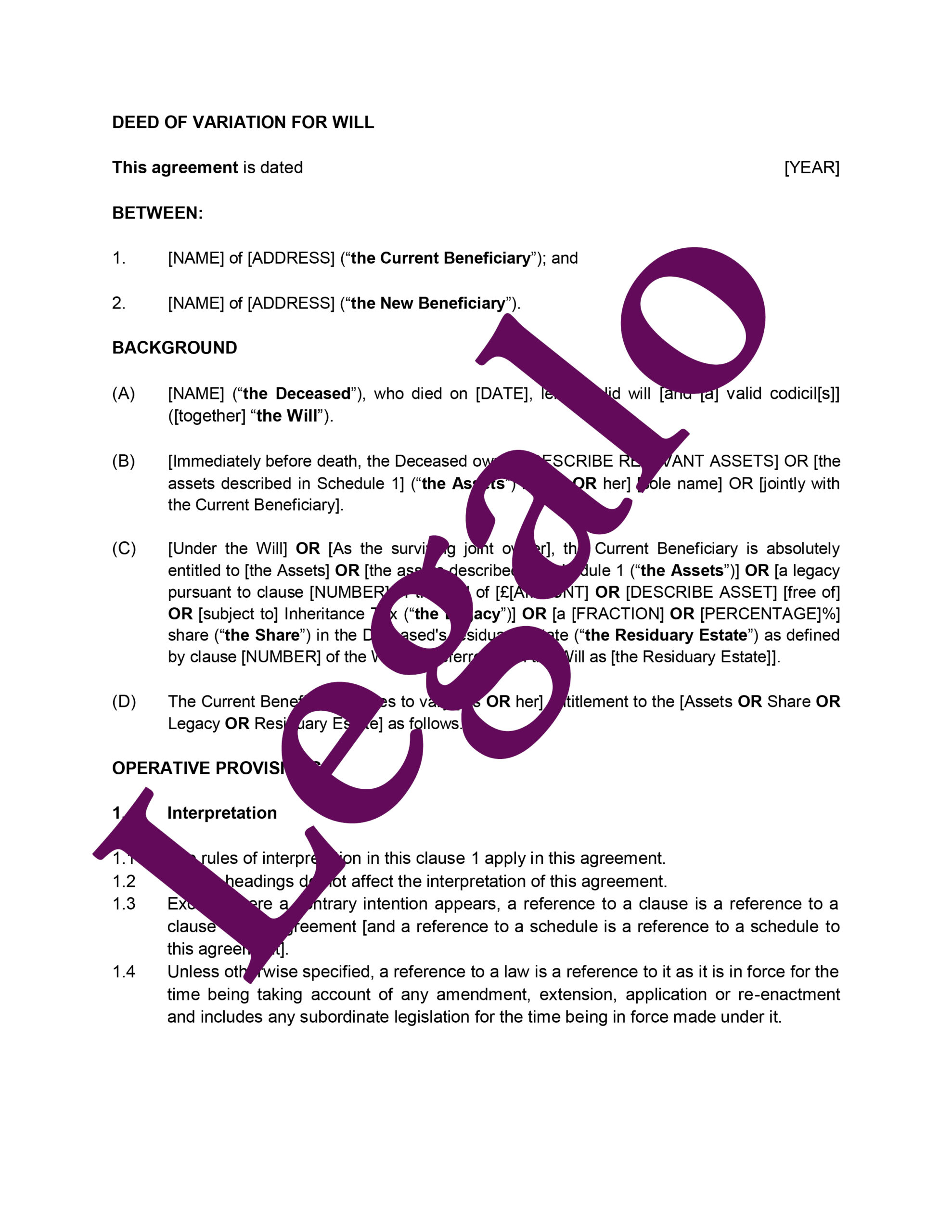 Because of the custom nature of a deed of variation, it’s quite hard to produce a template, they really are bespoke to each person and situation. In general, the deed will include the following items: